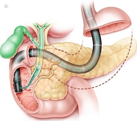 Procedimiento endoscópico que combina imágenes y rayos X para examinar y diagnosticar enfermedades de los conductos biliares y pancreáticos, como cálculos, inflamaciones o estrechamientos.